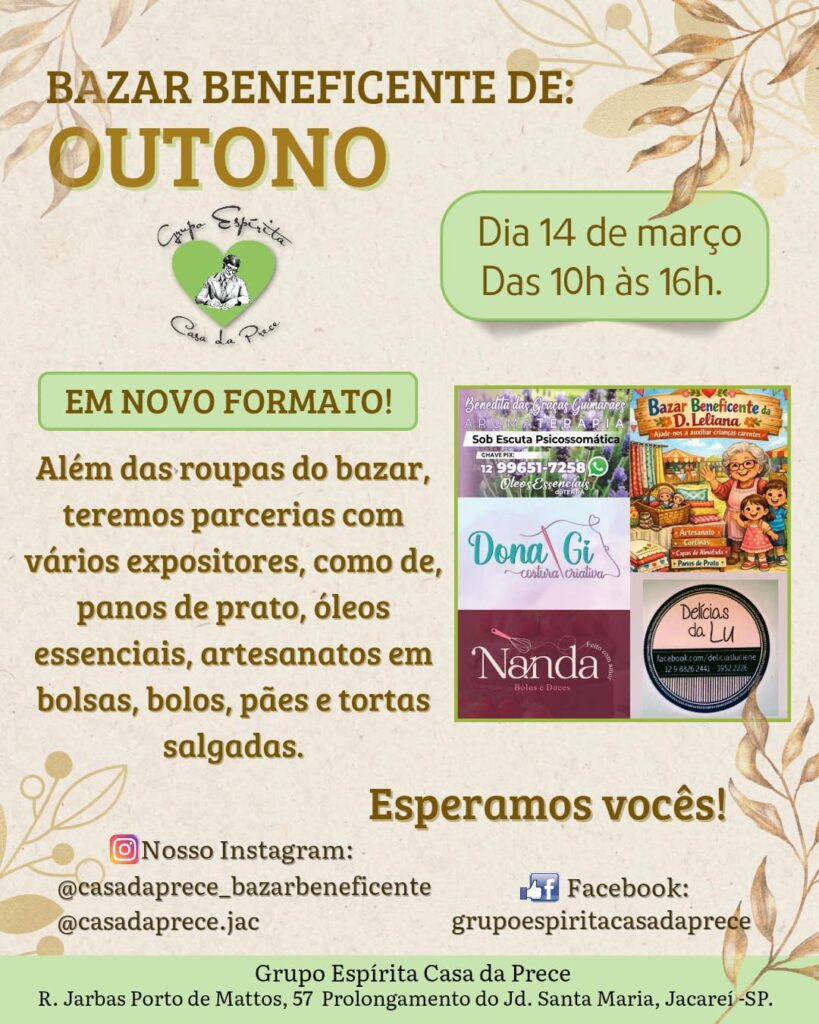 A Casa da Prece realiza Bazar Beneficente de Outono no sábado dia 14
