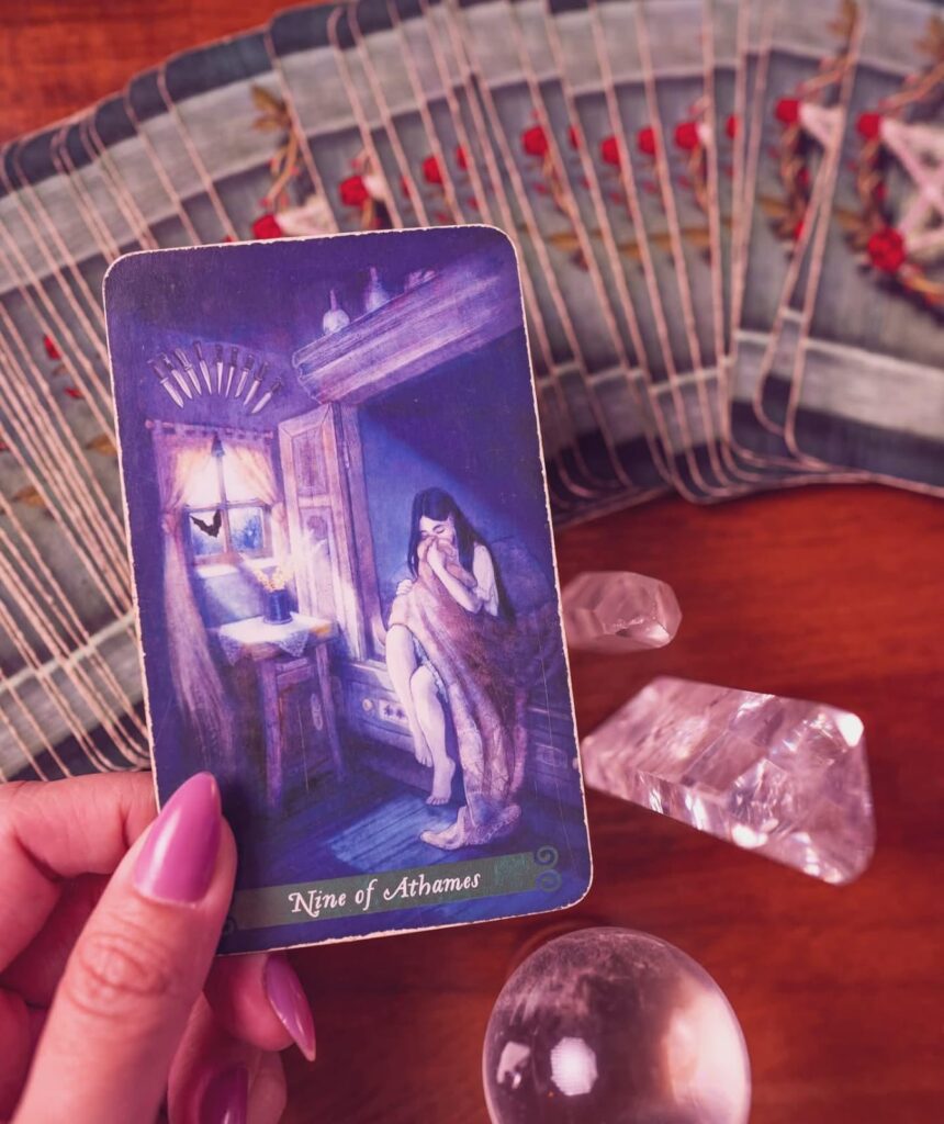-Confesso que, há algumas noites, venho dormido pouco… Indo para a cama muito tarde e acordando bem cedo no dia seguinte. E como o Tarot não é bobo nem nada, mandou aqui como carta da semana um belo de um 9 de Espadas – uma carta que fala sobre cuidarmos melhor do nosso sono.