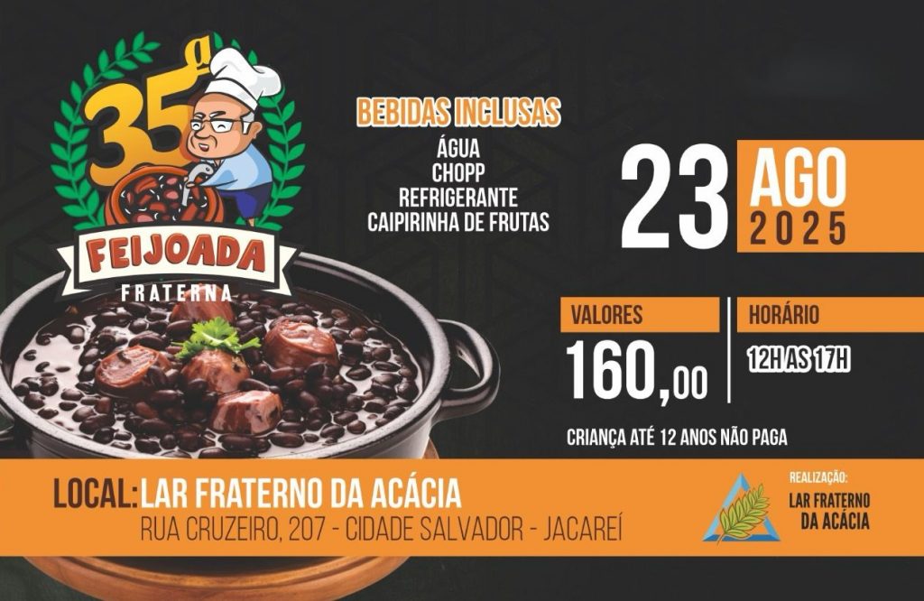 A 35ª Feijoada do Lar da Acácia, acontece no sábado dia 23 de agosto, das 12h às 17hs. O valor é R$ 160,00 com bebidas inclusas: Chopp, caipirinhas de frutas e refrigerantes e água. Crianças até 12 anos não paga.