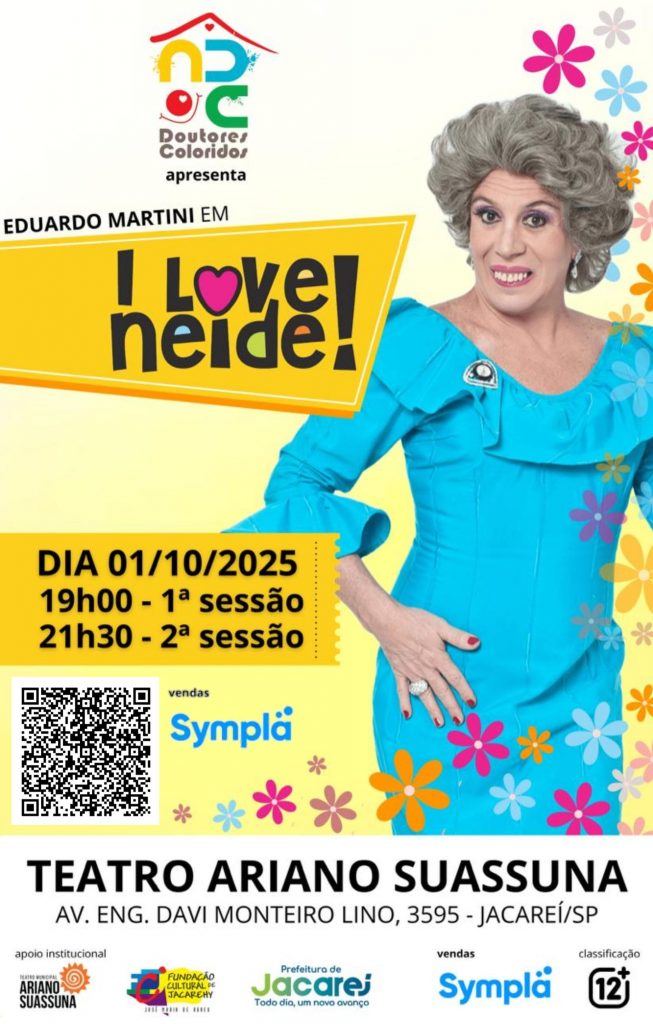 “I Love Neide”. O espetáculo será apresentado em duas sessões: às 19h e às 21h30, no teatro Municipal Ariano Suassuna, na avenida Eng. . Davi Monteiro Lino, 3595, no bairro Jardim Marcondes