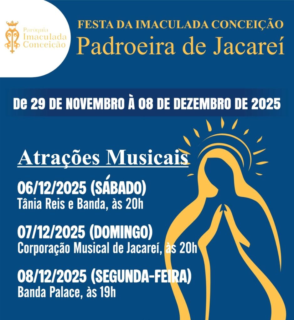 Dia Solene: Em 8 de dezembro, feriado municipal, a padroeira Imaculada será celebrada em três missas: 7h, 9h e 11h – sendo este último horário com a presidência de Dom Cesar Teixeira, bispo diocesano de São José dos Campos. Às 16h, está programada uma procissão que percorrerá as principais ruas do centro de Jacareí, com saída da Praça Anchieta. Em seguida, haverá momentos de coroação e consagração solene à Nossa Senhora.