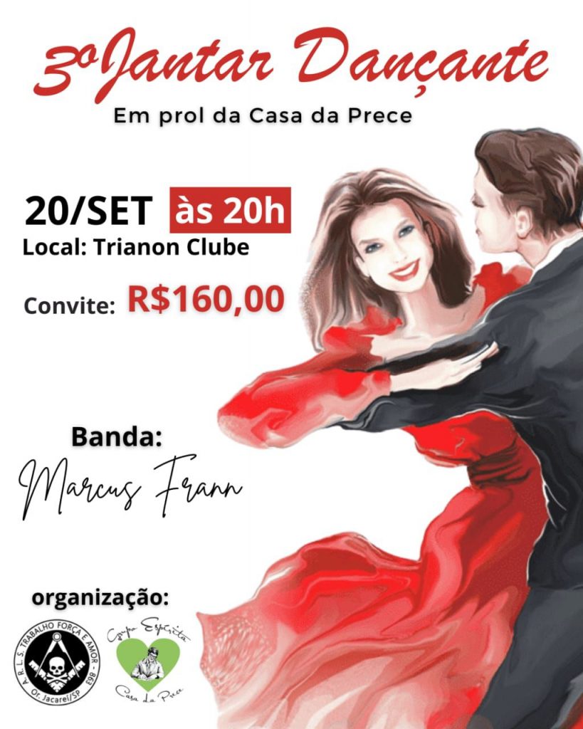 O “3ºJantar Dançante” será realizado pela Casa da Prece. O evento acontece no sábado, dia 20 de setembro às 20hs, no salão de festas do Trianon Clube na avenida Japão, 250- Jardim Marister. A animação será da Banda Marcus Frann.